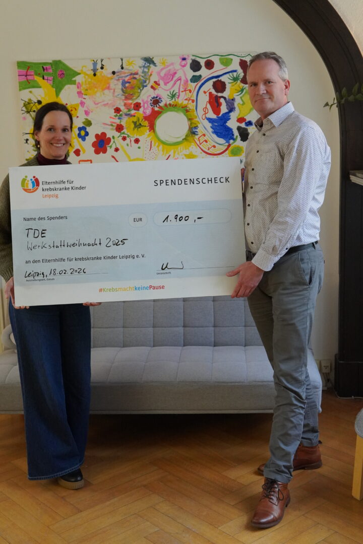 Am 18. Februar 2026 überreichte die TDE Mitteldeutsche Bergbau Service GmbH, vertreten durch unseren Geschäftsführer Herrn Huber, einen Spendenscheck in Höhe von 1.900,00 € an die Elternhilfe für krebskranke Kinder Leipzig e.V..